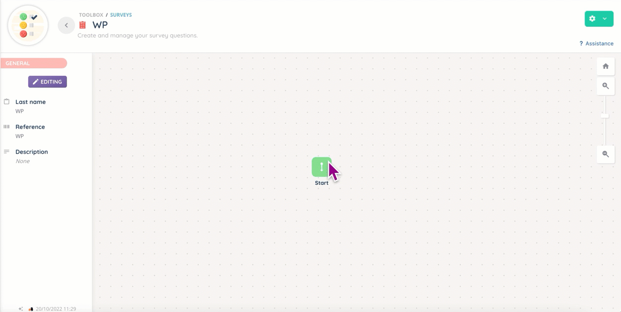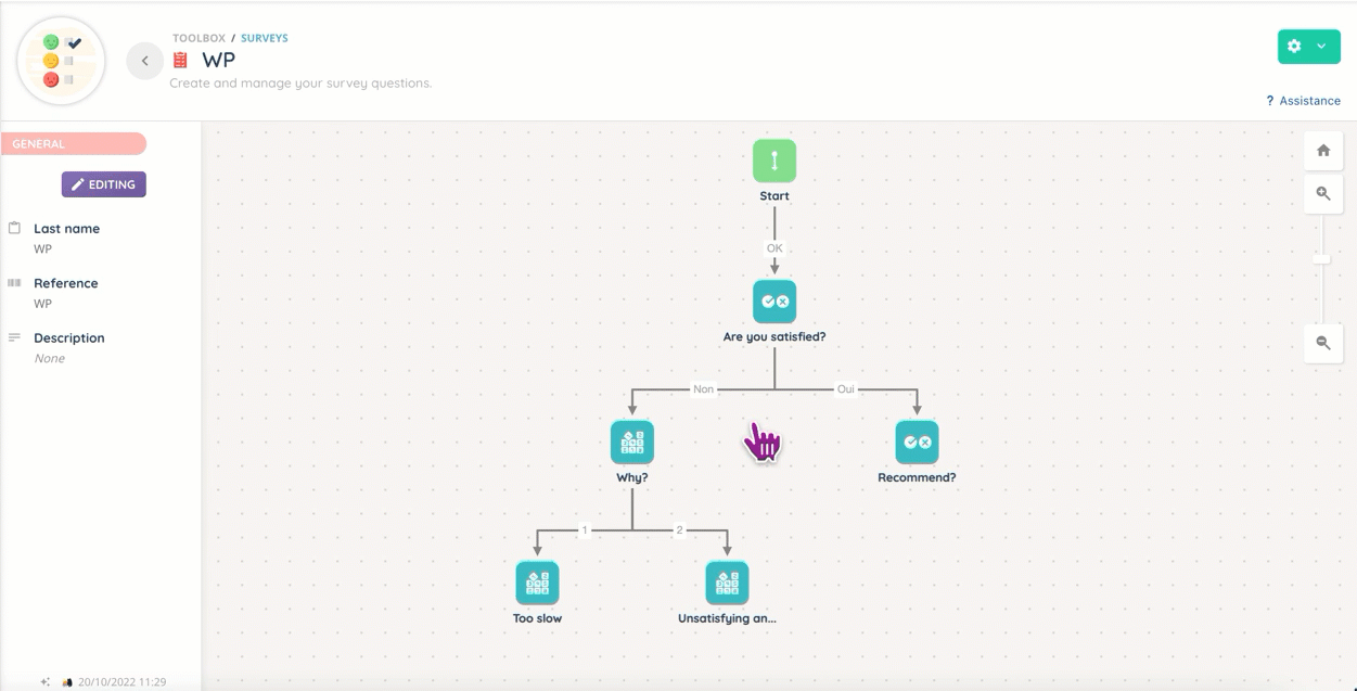 Surveys take the form of a tree in which you can add two types of questions, and organize them into branches.