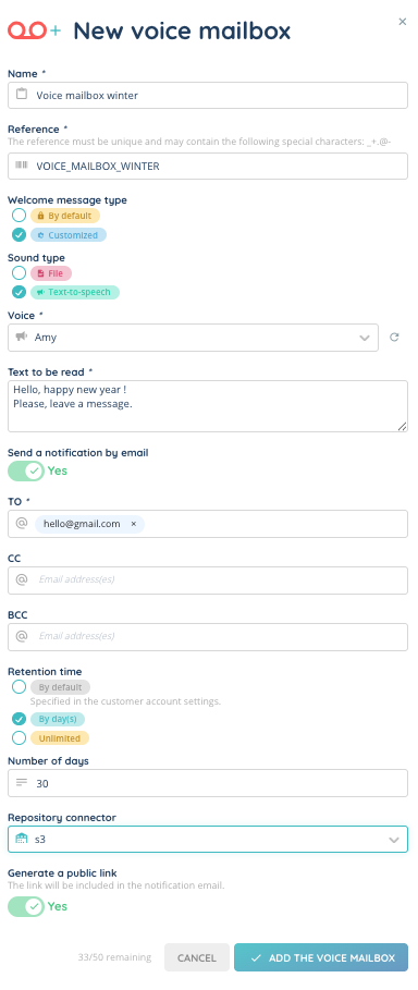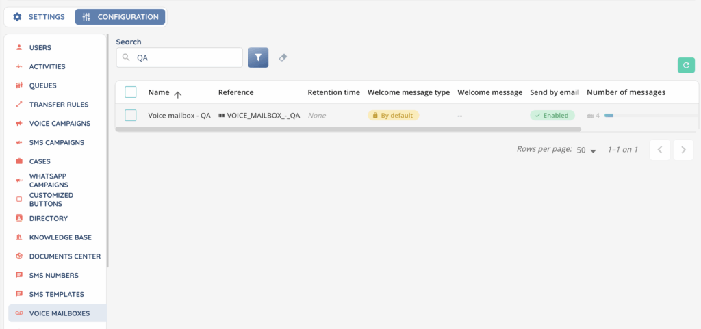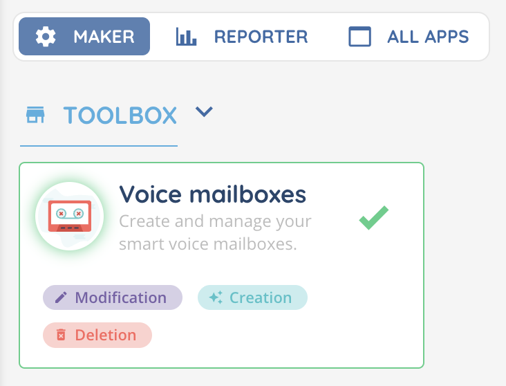 The Voice mailboxes module in the Maker allows you to create and manage voicemail boxes used in your Smart Routings. From this module, you can configure welcome messages, retention rules, notification settings, and repository options. Existing voicemail boxes can also be modified, duplicated, or deleted depending on your permissions.