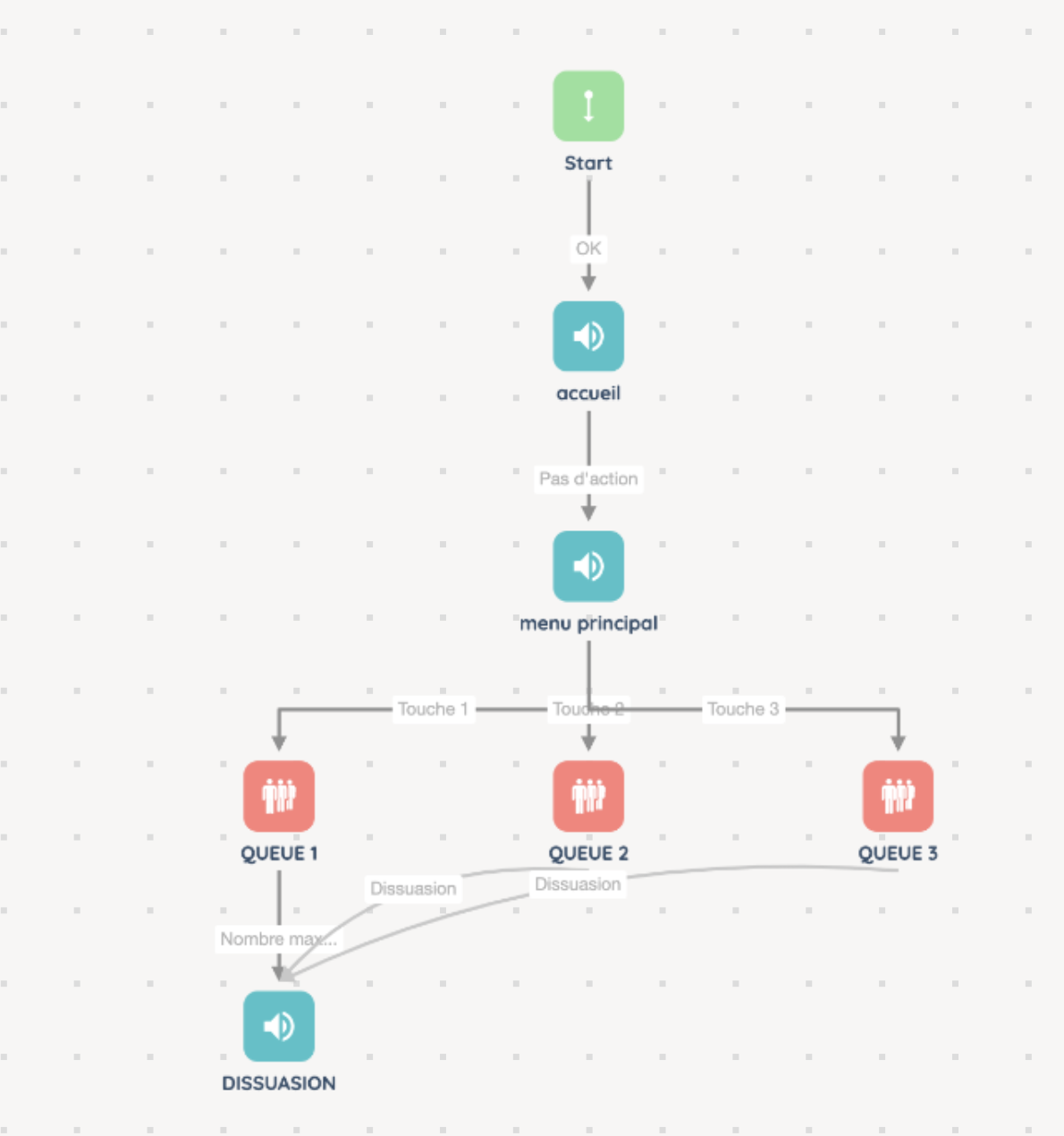 Upon creation, each action opens branches, the number of which may vary depending on the chosen type, and as many scenarios to consider: a voice announcement allows the caller to press (or not) a certain number of keys. Which ones will be useful?