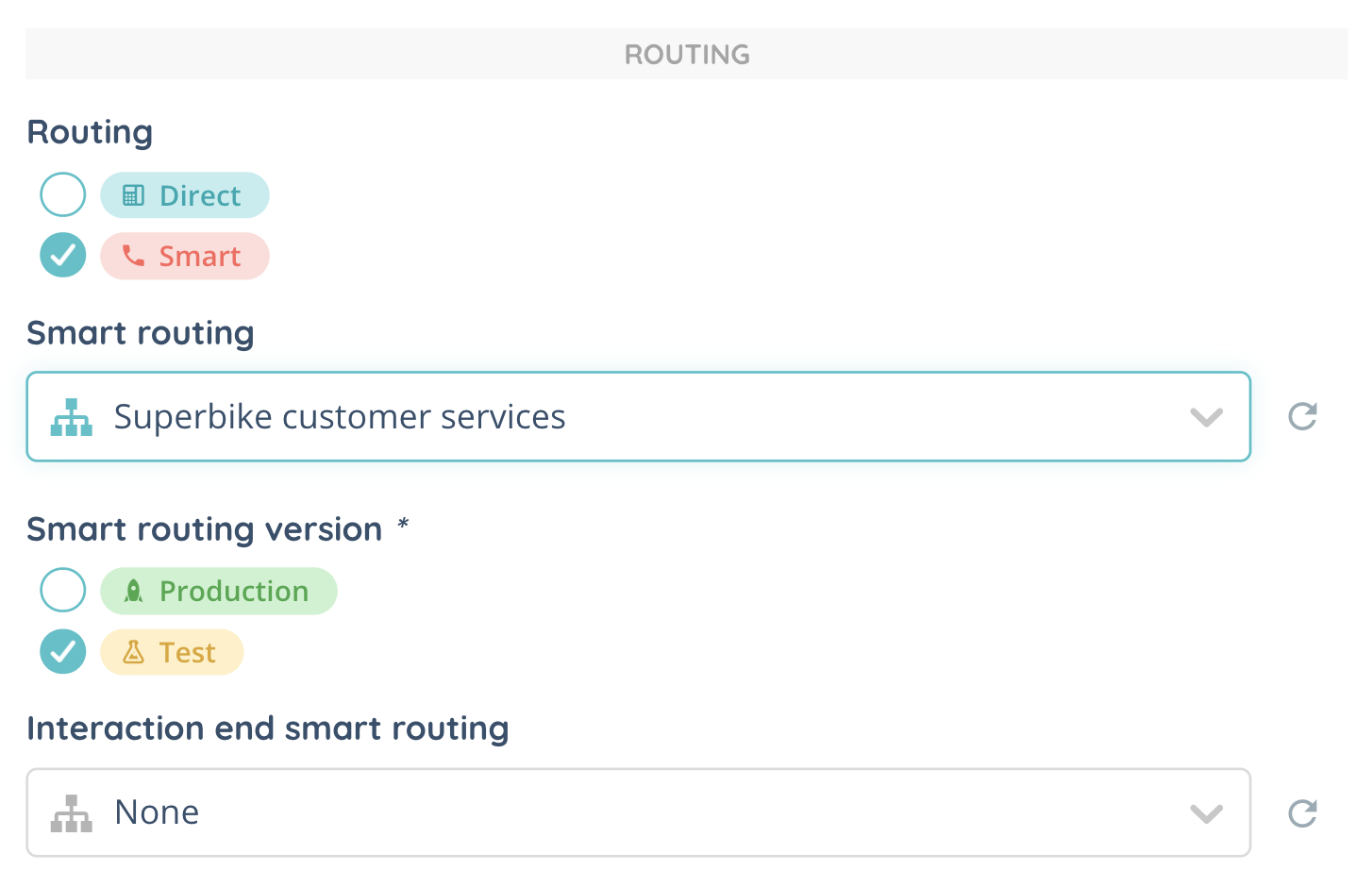The “In test” and “In production” statuses are useful if you need to link a routing to a phone number or an email. There, you will be asked to choose a Smart routing and its status:
