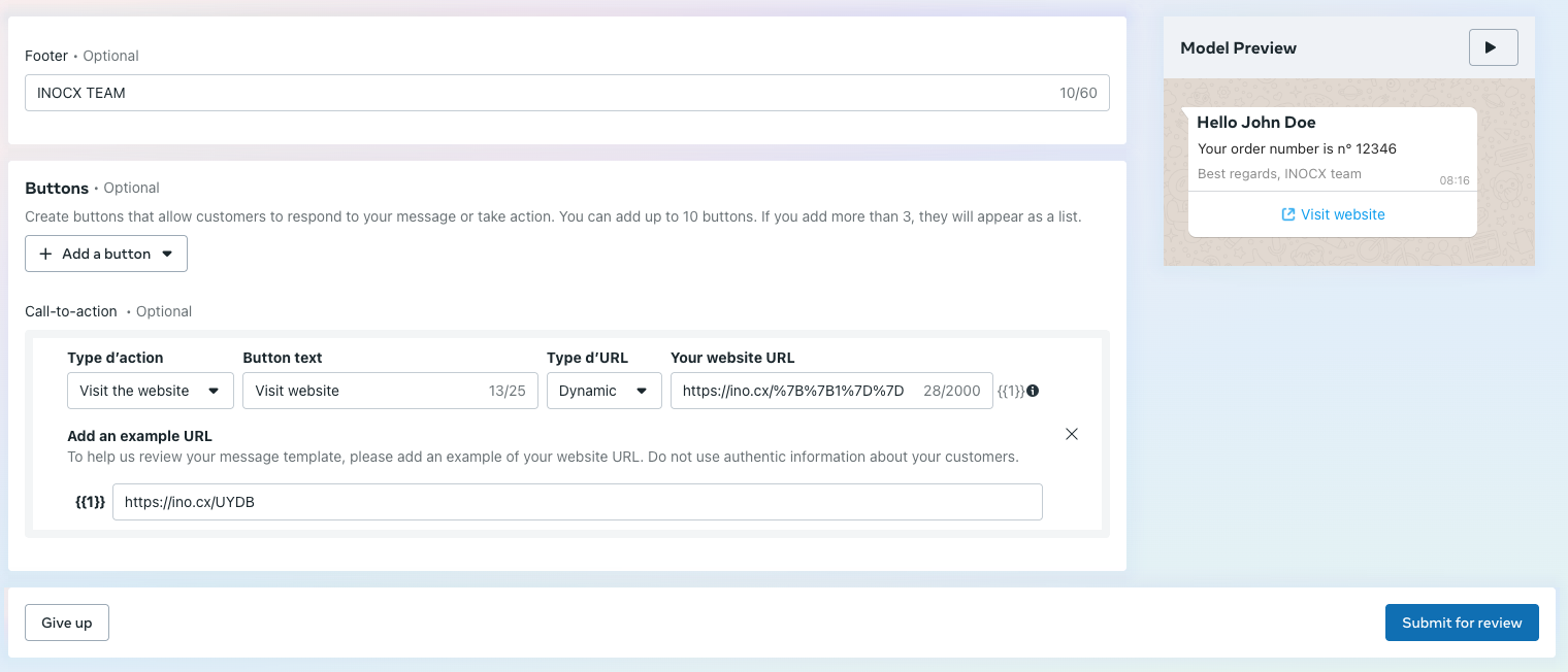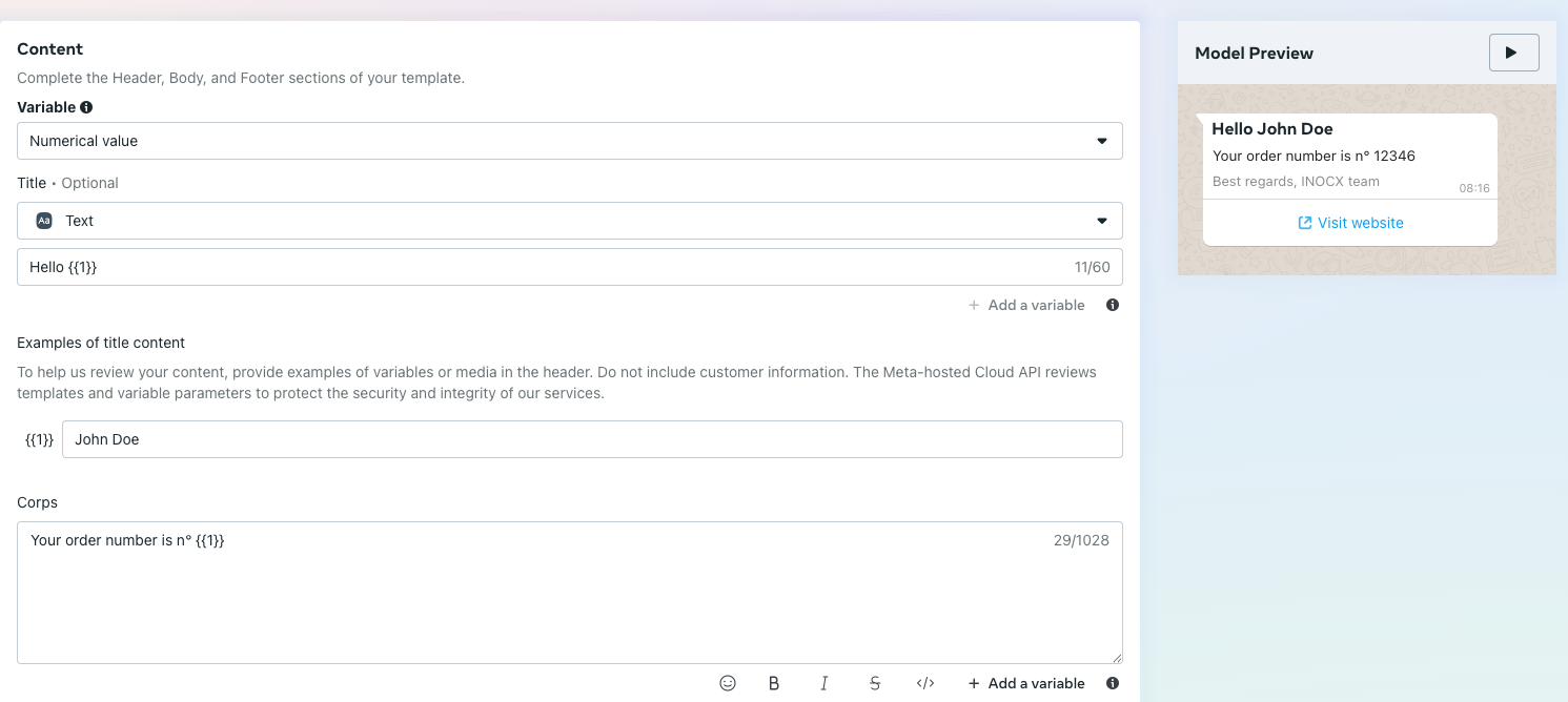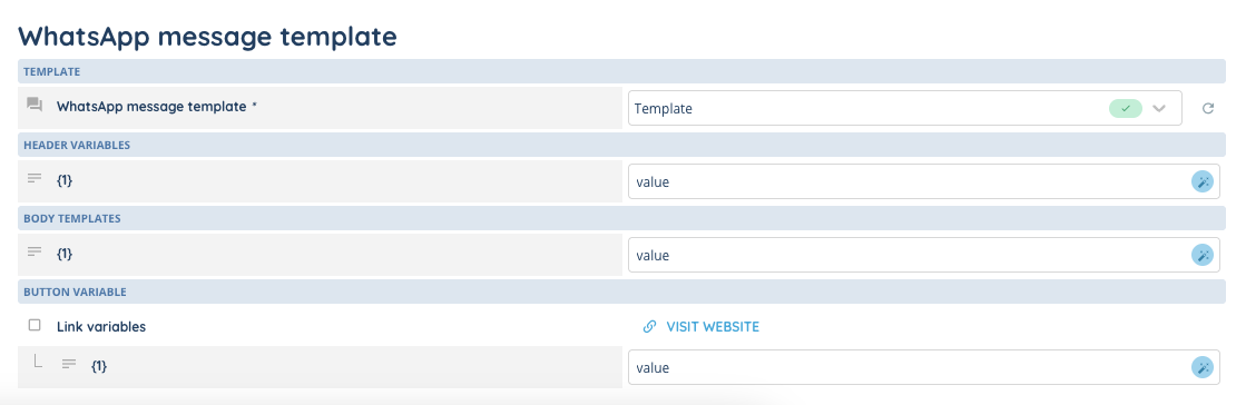 ⚠️ Message templates (content, title, buttons) must be created and approved directly in Meta Business Manager.