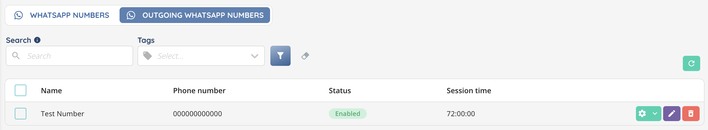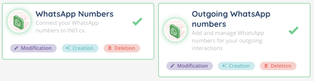 - Outgoing WhatsApp numbers: access, creation, modification, deletion