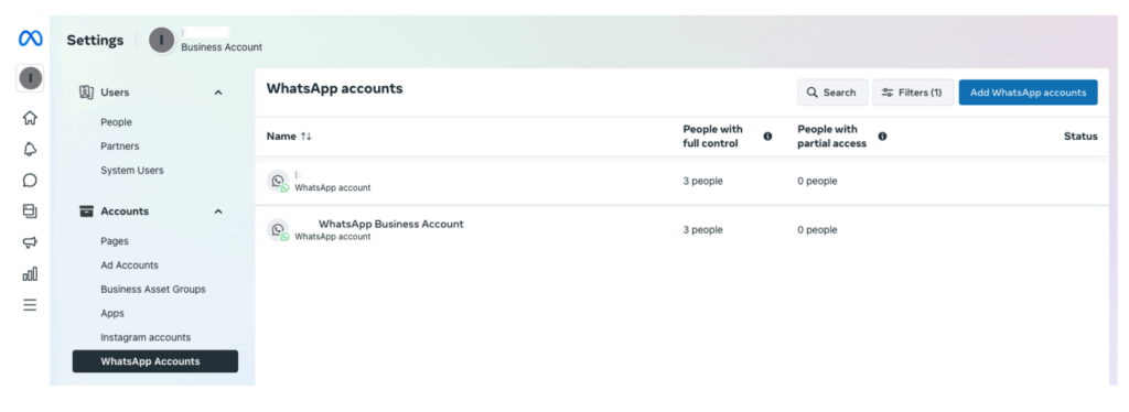 - Create a WhatsApp account under Business Settings > Accounts > WhatsApp Accounts.
