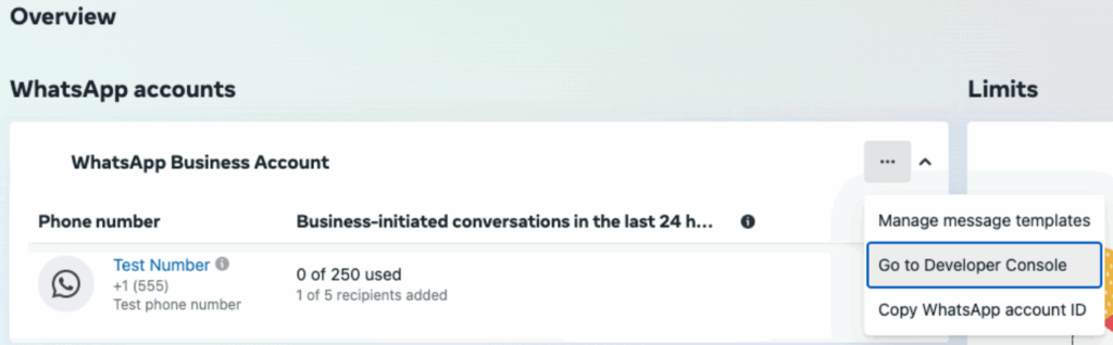 - Create a new application in the Meta for Developers console. (WhatsApp Manager > Overview > Go to developers console) then Create an app > Other > Select Business type)
