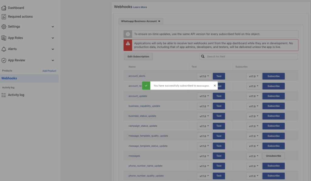- In Meta Webhook menu, choose WhatsApp Business Account from the dropdown list and subscribe to the messages webhook.