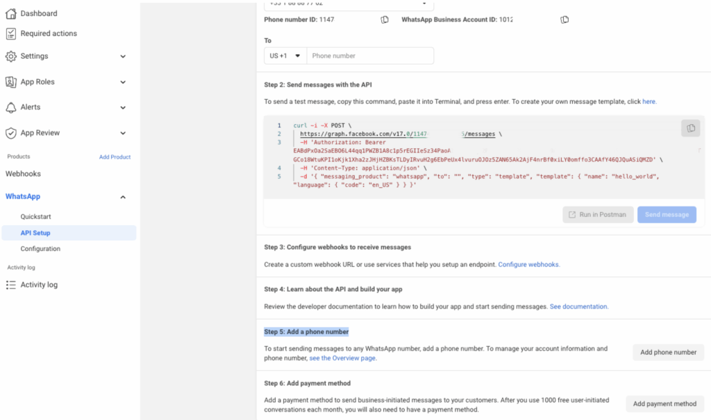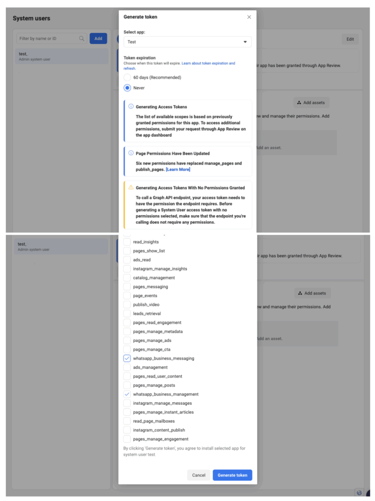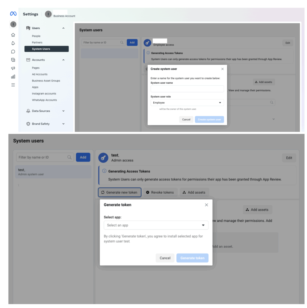 - Once the application and number are created, create a system user in Meta to generate a permanent access token:
