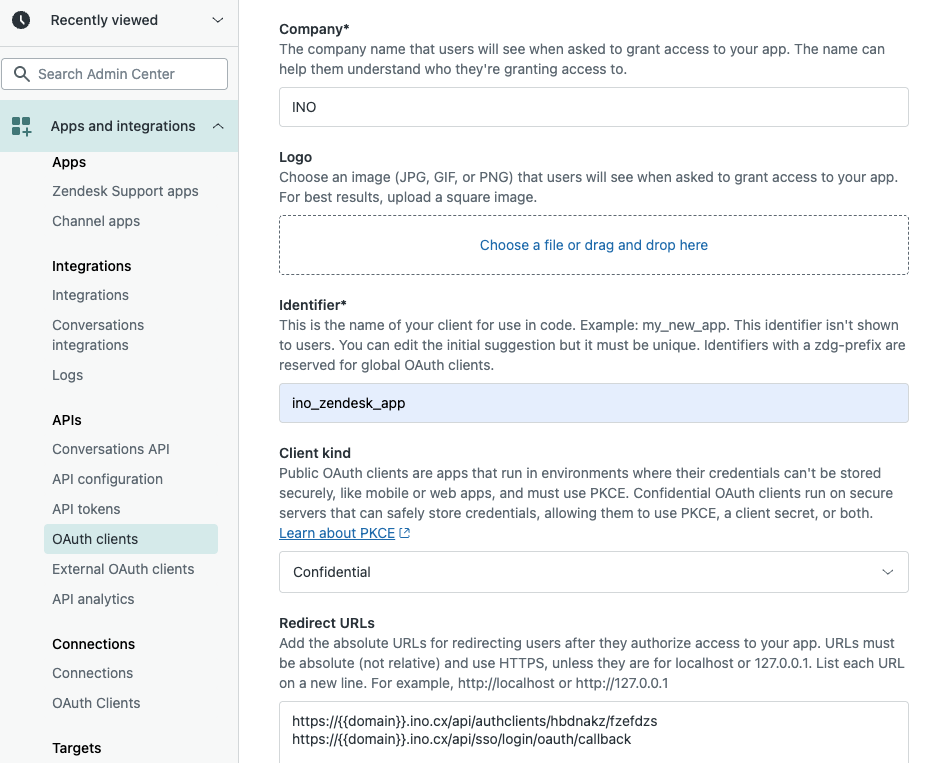 https://{{domain}}.ino.cx/api/authclients/hbdnakz/fzefdzshttps://{{domain}}.ino.cx/api/sso/login/oauth/callback - Save – the client secret key is generated and must be stored securely (it will not be visible again).