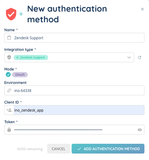 - In INO cx, create a new Authentication Method of type Zendesk Support.