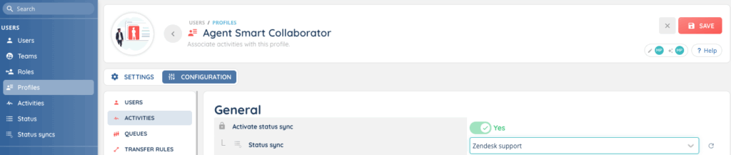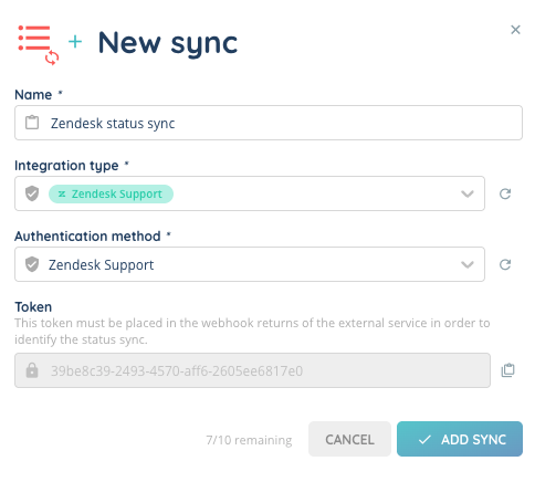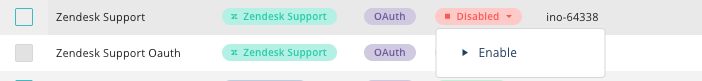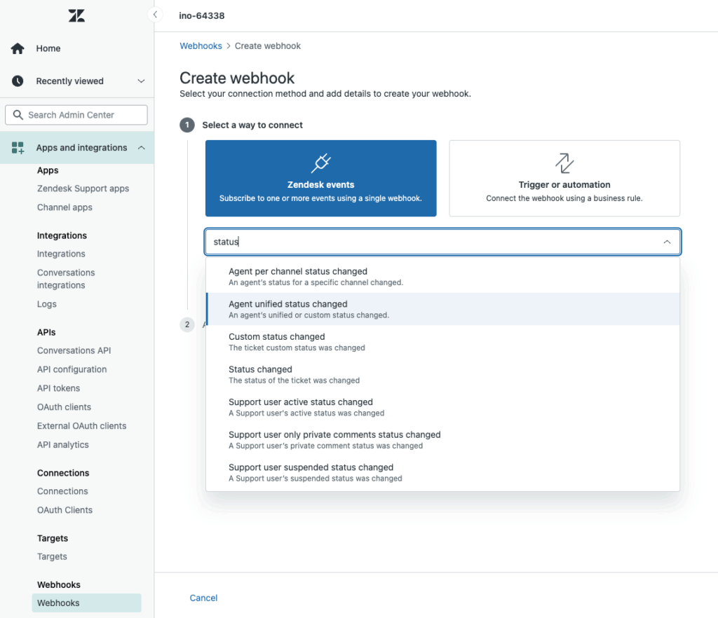 - In INO cx, create a new entry under Status Synchronization of type Zendesk Support with the previously defined authentication method.