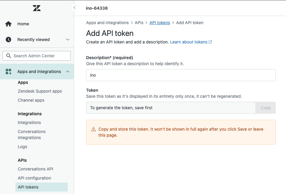 - Create a new API Token under Admin Center > Apps and integrations > API > Tokens.