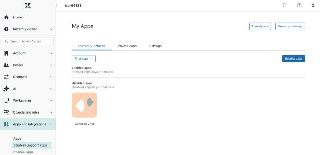- Click ‘Upload private app’ to upload the INO cx app for Zendesk. The INO cx team will provide you with the package archive.